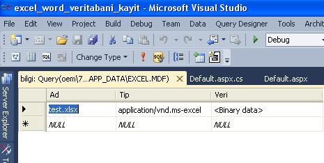 Merhaba arkadaşlar,bu makalemizde Excel, Word, Pdf, Image dosyalarını Sql veritabanımıza binary formatında kaydedeceğiz. Formunuza 1 adet FileUpload, Button ve Label ekleyin.